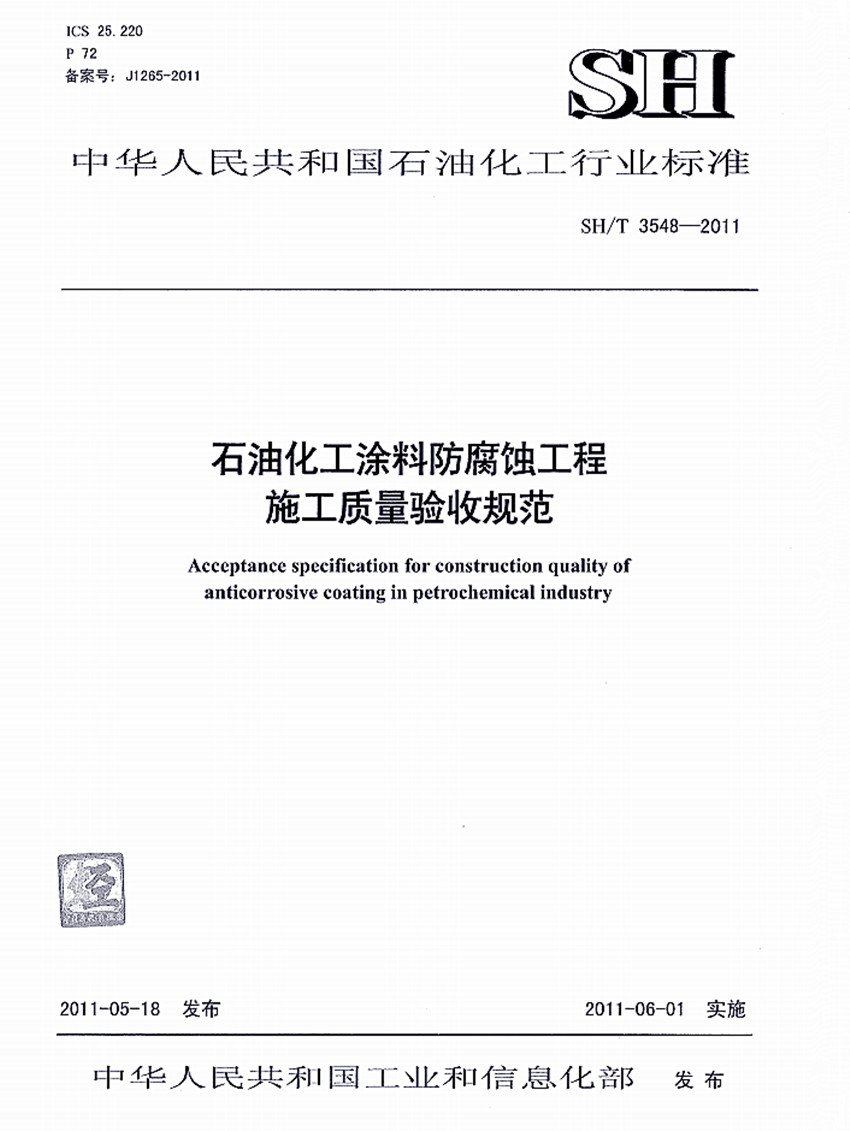 石油化工涂料防腐蝕工程施工施工質(zhì)量驗收規(guī)范標(biāo)準(zhǔn)SH/T 3548-2011 ICS25.220 P72 備案號:J1265-2011 SH 中華人民共和國石油化工行業(yè)標(biāo)準(zhǔn) SH/T 3548-2011石油化工涂料防腐蝕工程施工施工質(zhì)量驗收規(guī)范 Acceptance spccificatinon for construction quality of anticorrosive coating in