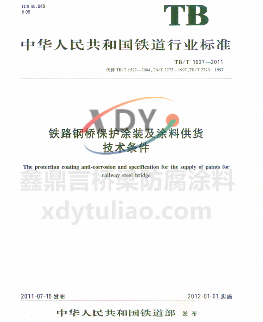 TB/T 1527-2011鐵路鋼橋保護(hù)涂裝及涂料供貨技術(shù)條件 華人民共和國鐵道行業(yè)標(biāo)準(zhǔn) TB/T 1527-2011代替TB/T 1527-2004、TB/T 2772-1997、TB/T 2773-1997 鐵路鋼橋保護(hù)涂裝及涂料供貨技術(shù)條件 The protection coating anti-corrosion and specification for the supply of pa