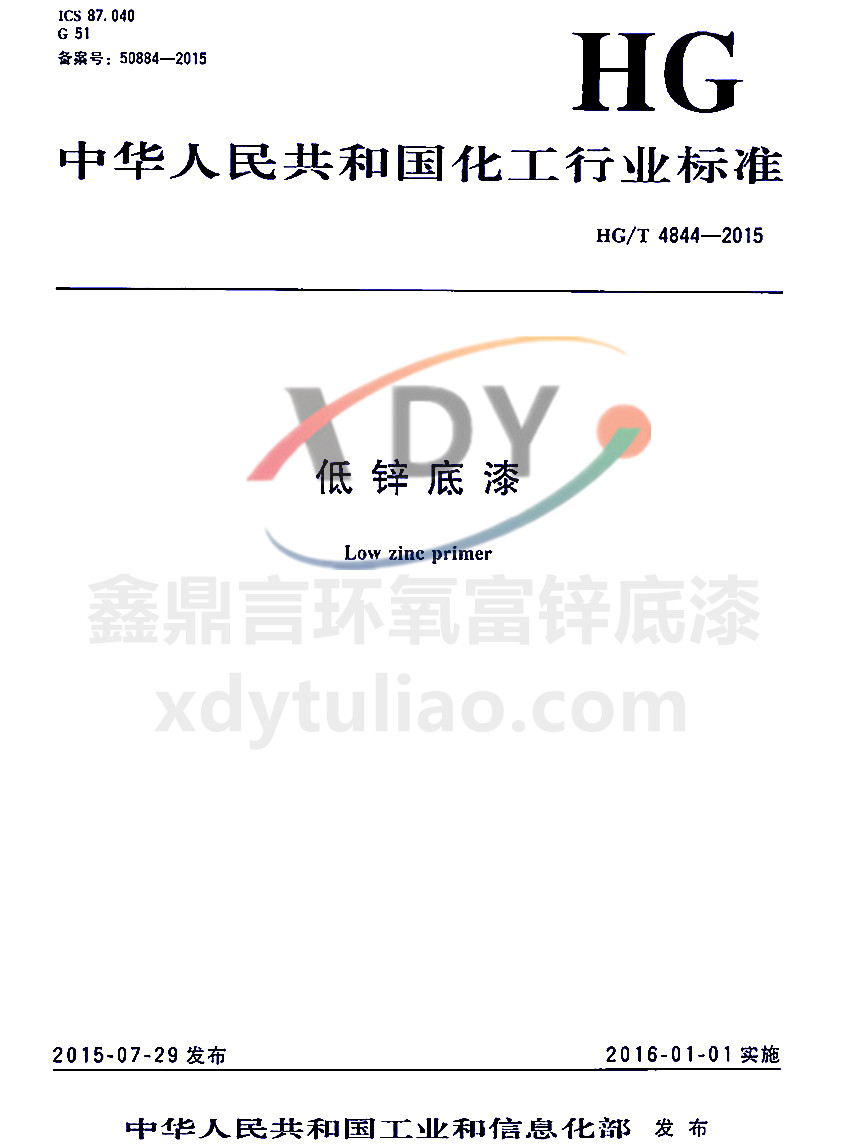 ICS 87.040 G51 備案號(hào):50884-2005 HG 中華人民共和國化工行業(yè)標(biāo)準(zhǔn) HG/T 4844-2015 低鋅底漆Low zinc primer 2015-07-29發(fā)布 2016-01-01實(shí)施 中華人民共和國工業(yè)和信息化部 發(fā)布 本標(biāo)準(zhǔn)規(guī)定了低鋅底漆的產(chǎn)品分類、要求、試驗(yàn)方法、檢驗(yàn)規(guī)則、標(biāo)志、包裝和貯存。本標(biāo)準(zhǔn)適用于不揮發(fā)分中金屬鋅含量低于60%但不低于40%的低鋅涂