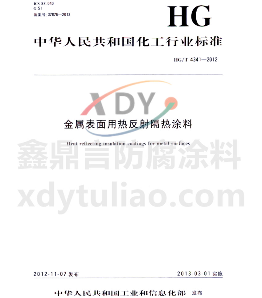 HG/T 4341-2012金屬表面用熱反射隔熱涂料標(biāo)準(zhǔn) ICS 87.040 G51 備案號(hào):37876-2013 HG 中華人民共和國化工行業(yè)標(biāo)準(zhǔn) HG/T4341-2012 金屬表面用熱反射隔熱涂料heat reflection coatings for metal surfaces 2012-11-07發(fā)布 2013-03-01實(shí)施 中華人民共和國工業(yè)和信息化部發(fā)布 本標(biāo)準(zhǔn)規(guī)定了金屬表面用