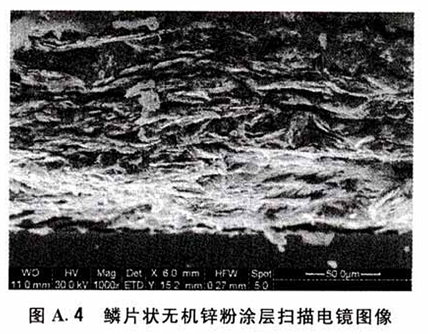 圖A.4 鱗片狀無機鋅粉涂層掃描電鏡圖像