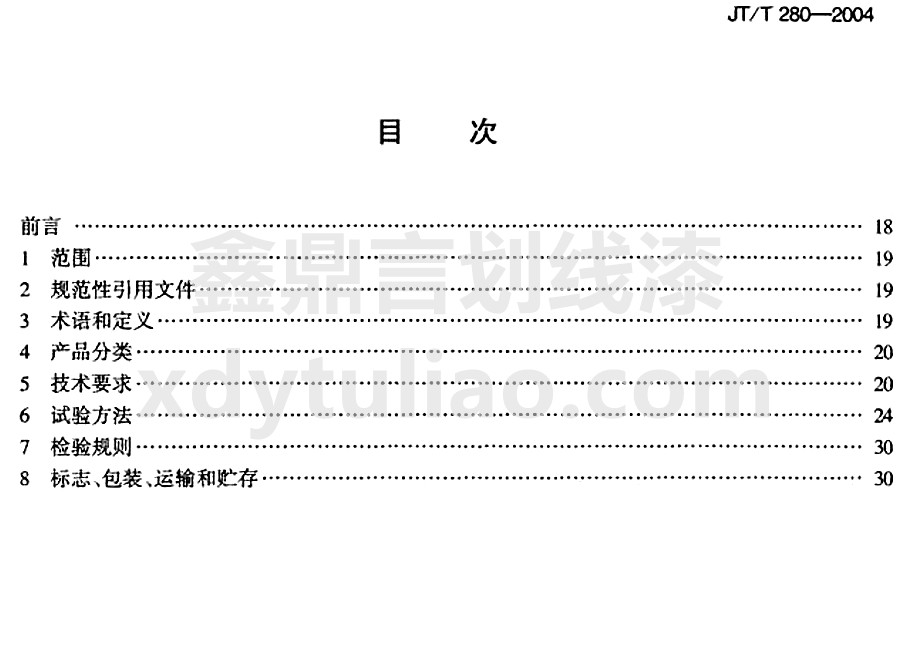 JT/T 280-2004路面標(biāo)線涂料標(biāo)準(zhǔn)是小編照搬JT/T 280-2004《路面標(biāo)線涂料》紙質(zhì)版內(nèi)容,大家可以放心參考。更多防腐涂料執(zhí)行國家和行業(yè)標(biāo)準(zhǔn)等防腐涂料相關(guān)信息可以參與網(wǎng)站:m.chicgate.com