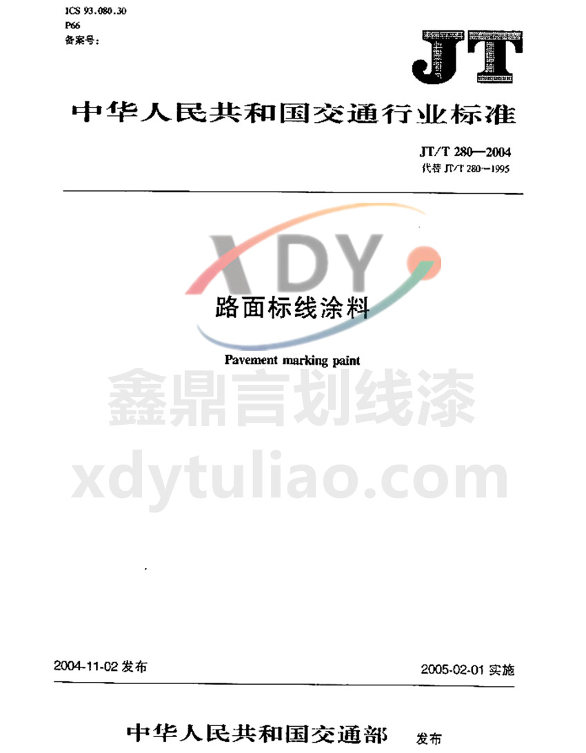 JT/T 280-2004路面標(biāo)線涂料標(biāo)準(zhǔn)是防腐涂料小編照搬JT/T 280-2004《路面標(biāo)線涂料》紙質(zhì)版內(nèi)容,大家可以放心參考。更多防腐涂料執(zhí)行國(guó)家和行業(yè)標(biāo)準(zhǔn)等防腐涂料相關(guān)信息可以參考官網(wǎng):m.chicgate.com ICS 93.080.30 P66 JT 中華人民共和國(guó)交通運(yùn)輸行業(yè)標(biāo)準(zhǔn) JT/T 280-2004路面標(biāo)線涂料Pavement